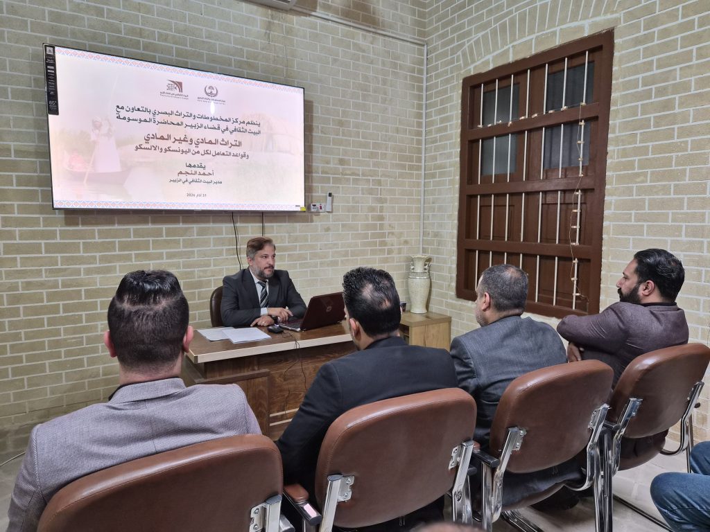 أقام مركز المخطوطات والتراث البصري التابع الى ديوان محافظة البصرة بالتعاون مع البيت الثقافي في قضاء الزبير التابع الى دائرة الشؤون الثقافية العامة في وزارة الثقافة والسياحة والآثار محاضرة تحت عنوان (التراث المادي وغير المادي وقواعد التعامل لكل من اليونسكو والالسكو).